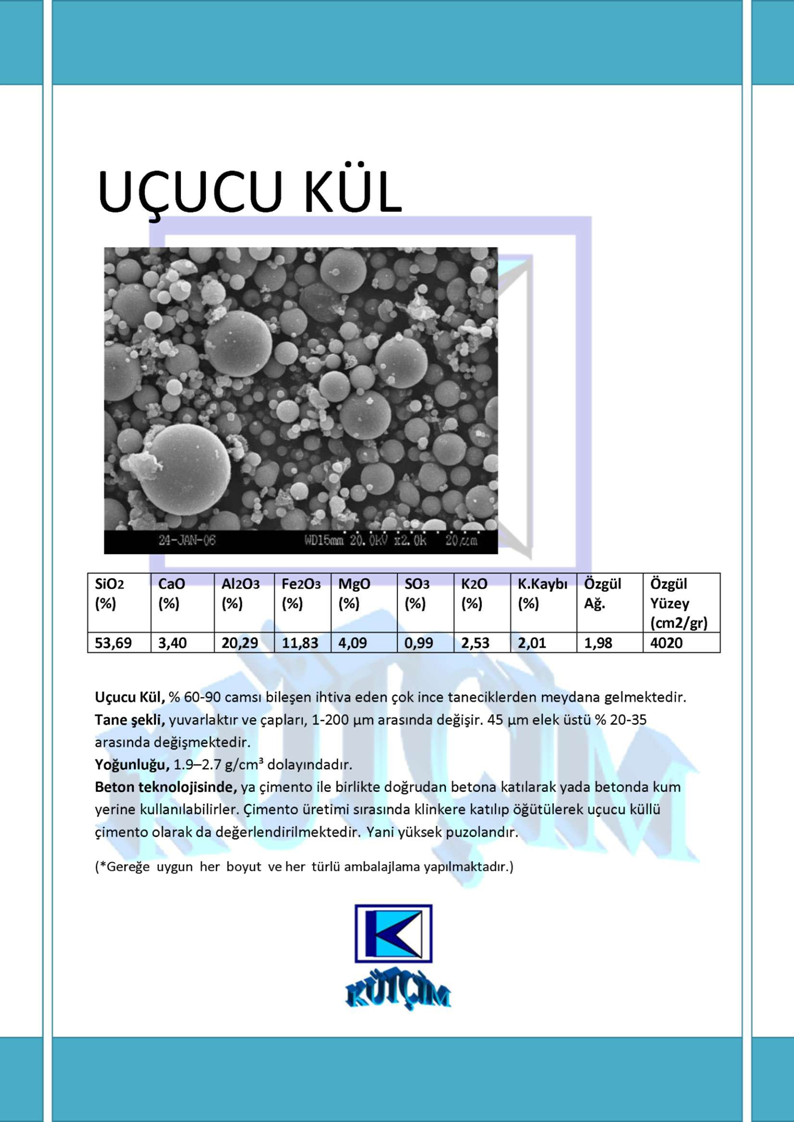 UK, % 60-90 camsı bileşen ihtiva eden çok ince taneciklerden meydana gelmektedir. UK ’ün tane şekli, yuvarlaktır ve çapları, 1-200 μm arasında değişir. Taneciklerin yaklaşık % 75’inin çapı 45 μm’den, % 50’den çoğu μm ’den büyüktür. Uçucu küllerin yoğunluğu 2.2–2.7 g/cm³ dolayındadır. Atıkların ana bölümünü oluşturan uçucu küllere ilave olarak küllerin klinkerlerle birleşip fırının dibine büyük parçacıkların oluşturduğu atıklardır. Bu da fırın dibi külü olarak adlandırılır. Bazı fırınlar kazan cürufu olarak bilinen ergimiş bir atık üretirler. Bu atıkta fırından atılarak genellikle su ile tanecikler haline getirilir. Bazı amaçlar için bu malzemeler agrega olarak kullanılabilir. Genelde beton için kullanılmazlar.