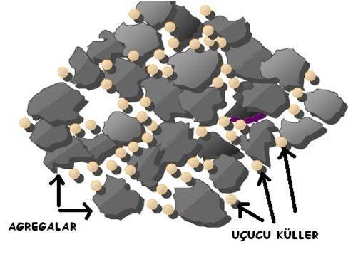 Uçucu küller Şekil 3’te görüldüğü gibi agregaların arasına girerek onları birbirine bağlar. Uçucu küller ince yapılı olduğundan boşlukları kapatabilir. UK’lar beton teknolojisinde ya çimento ile birlikte doğrudan betona katılarak yada betonda kum yerine kullanılabilirler. Çimento üretimi sırasında klinkere katılıp öğütülerek uçucu küllü çimento olarak da değerlendirilebilirler. Kum yerine kullanıldığında özgül yüzey artarsa da kumdan azda olsa tasarruf sağlanır. UK’ların puzolanik özellikleri dolayısıyla çimento yerine kullanmak daha avantajlıdır.